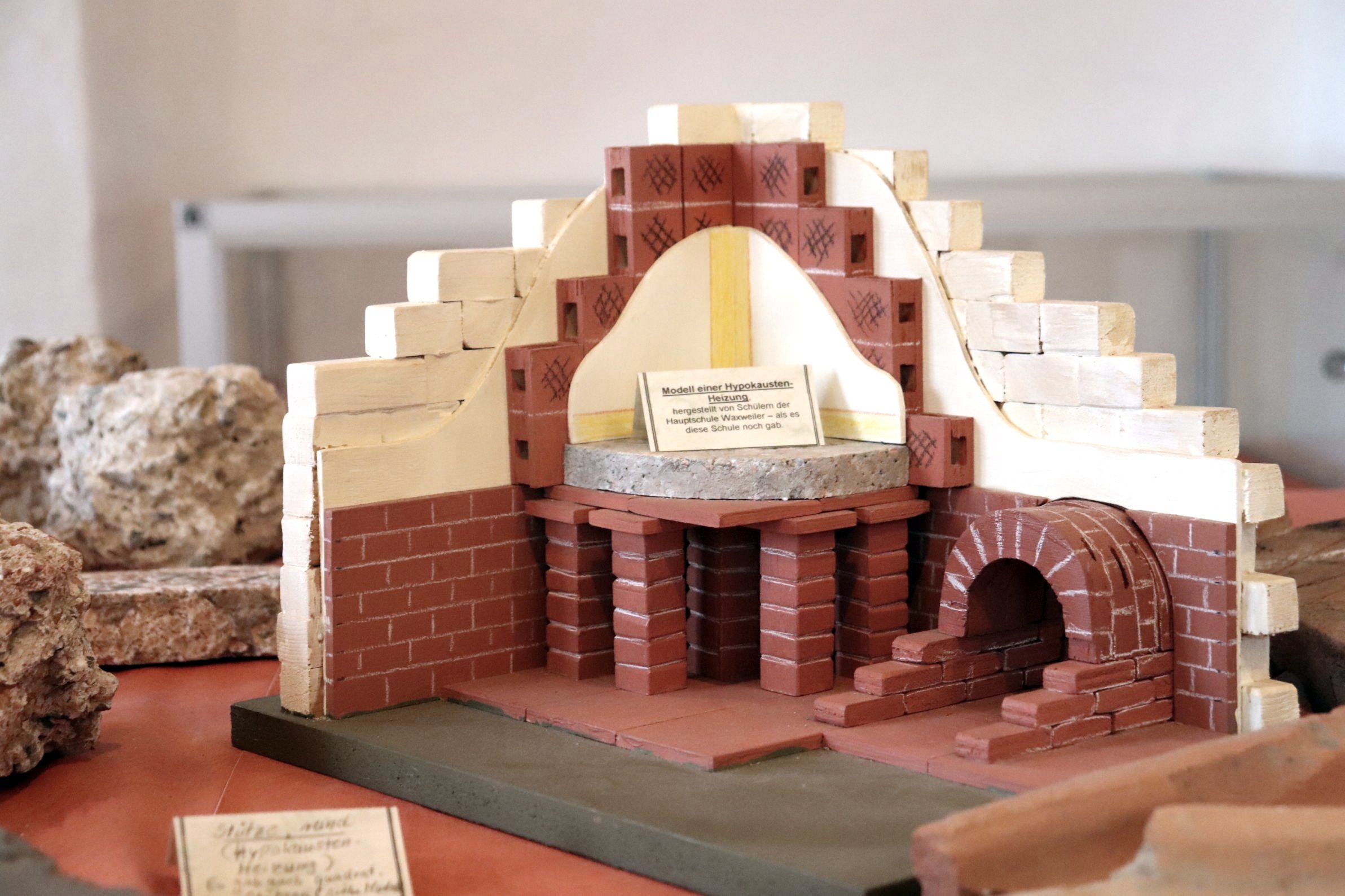 Der größte Teil der Grabungsfunde harrt noch einer Auswertung durch die Archäologen. Dennoch gibt es in dem kleinen Museum schon eine Vielzahl von Funden zu besichtigen, wie sie in den zahlreichen römischen Gutsanlagen des Trierer Landes typisch waren. Die qualitativ erstaunliche Wohnkultur und die gehobene Lebensart lassen sich hieran erkennen. Funde belegen, dass das Dach aus auf-genagelten Steinplatten bestand. Kiloweise wurden Nägel von der Dachplattennagelung gefunden, die durch Feuerhärtung (Niederbrennen der Anlage) erhalten geblieben sind. Kasten - / Hohlziegel, sog. Tubuli - sind Teile einer Wand - und Fußbodenheizung.Beheizt wurde ausschließlich der Südflügel mit der Badeanlage. Bei einer Wohnfläche von über 500 m2 im Erdgeschoss war es den Bewohnern möglich, sich im Winter in den beheizbaren Teil zurückzuziehen. Dicke Schichten von Ziegelklein - Estrich, die heute noch betonhart sind, zeigen uns, dass die Römer schon hervorragend mit noch heute modernen Baustoffen umgehen konnten.Münzen, damals Zahlungsmittel, sind für uns heute Datierungshilfen. Die in der Villa gefundene, hier abgebildete Münze zeigt auf der Vorderseite (Av.) Flavius Julius Constantius II., nach rechts blickend, in gepanzerter Büste mit Perlen -Diadem. Reg. 324-361 n. Chr., zweiter Sohn des Constantinus magnus. Prägestätte war Trier. Man schätzte auch einen guten Moseltropfen. Hiervon zeugt nicht nur der "Waxweiler Becher", sondern auch der etwas einfachere in der römischen Villa gefundene Weinbecher, der ebenfalls als sog.Schwarz-"Firnis"-Ware gefertigt ist.