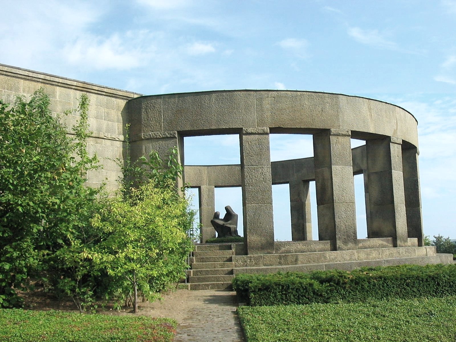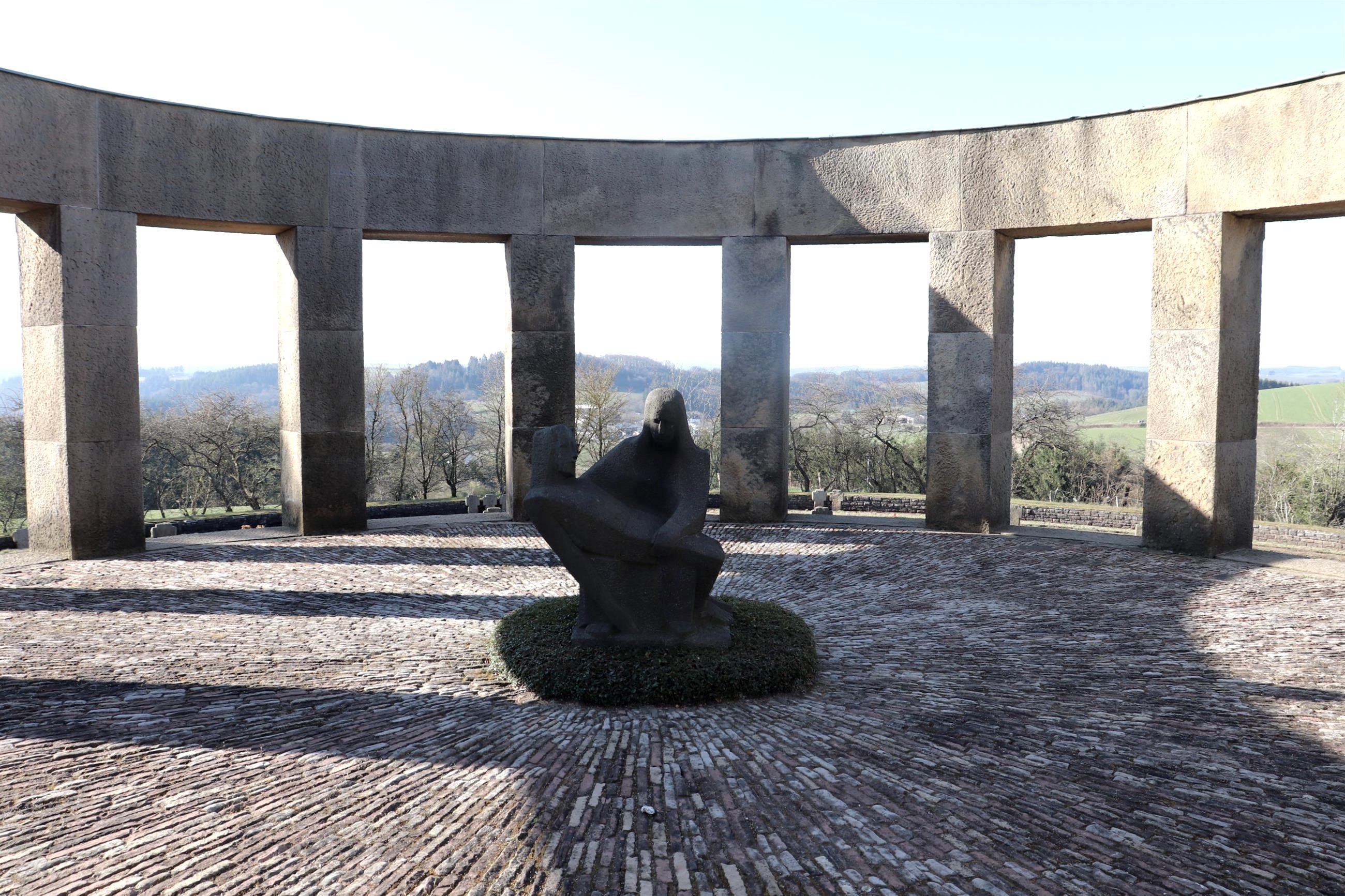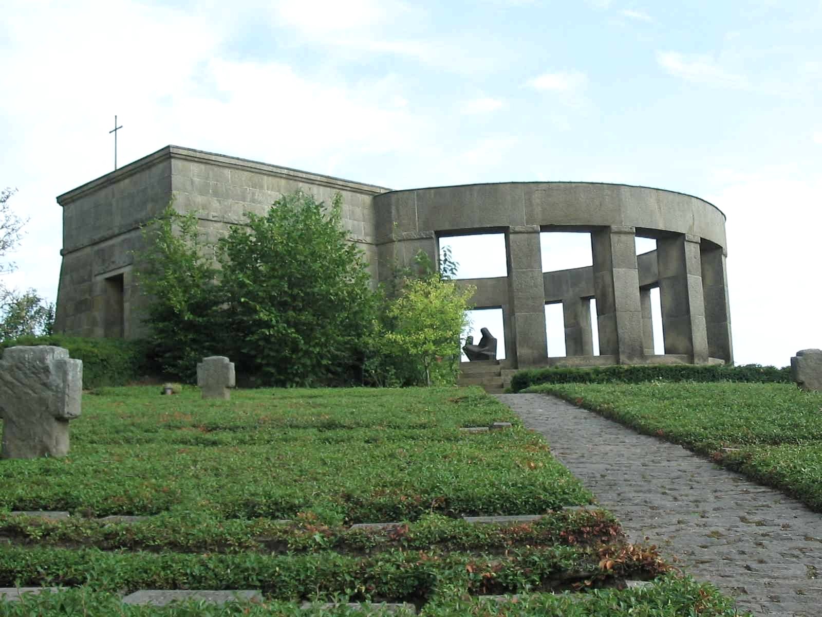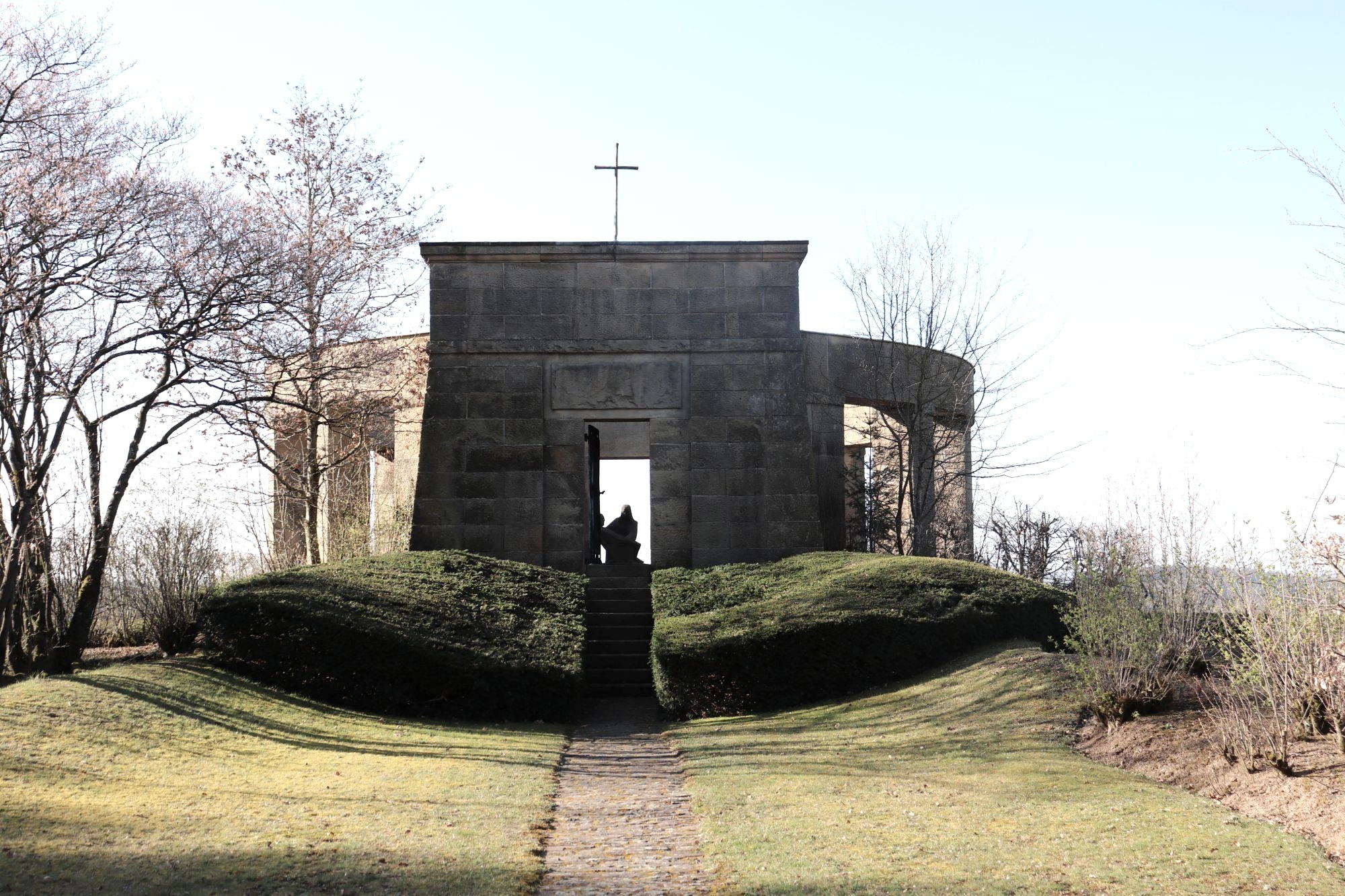 The war cemetery in Daleiden is the largest cemetery of honor in Rhineland-Palatinate with over 3,000 killed in World War II. The dead were buried on 72 smaller sites in the surrounding area until they were transferred to Daleiden. ln the natural slope of the slope, the rows of graves are arranged in the course of the heights, opened up by access and access routes to the individual graves, which are provided with a name stone. A retaining wall with a wall closes off the grave surface from the outside. Stations of the Cross lead to the cemetery. The cemetery of honor - instead of a small, baroque chapel - was built on a hill east of the village in 1954-59 to commemorate the soldiers of the Second World War who fell in the Eifel-Ardennes area. The tombs of 3,224 soldiers, laid out in several circular rows, run towards an open memorial room in the center of the ring. The memorial itself was designed as a pillar rotunda, in the middle of which is a stone Pietà in expressive forms. A memorial hall with the names of the fallen connects to the rotunda.