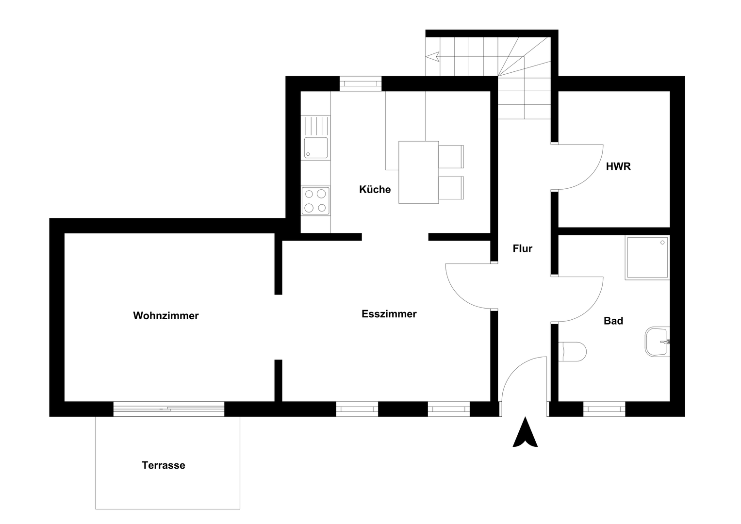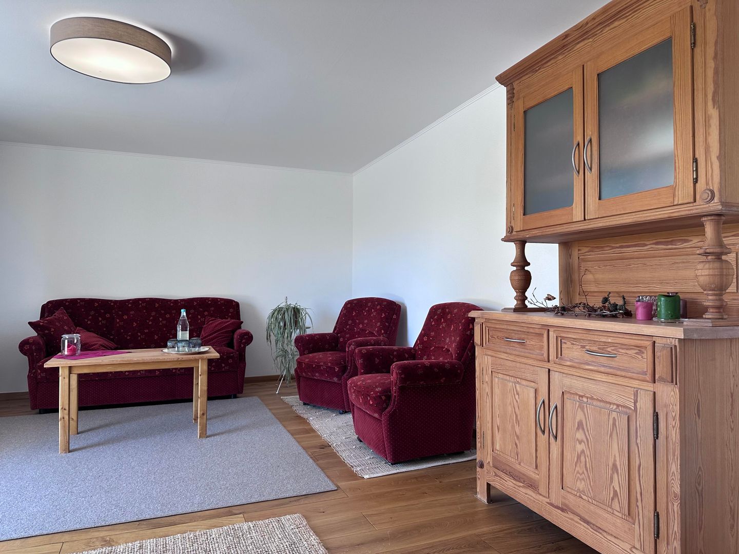 De keuken, woon- en eetkamer en een ruime badkamer bevinden zich op de begane grond van de flat, die niet drempelvrij is. Vanuit de woonkamer heb je toegang tot je eigen terras met uitzicht op de "Frauenpuhl", onze natuurlijke vijver, die niet bedoeld is voor gezamenlijk gebruik. De twee tweepersoonsslaapkamers bevinden zich op de eerste verdieping.