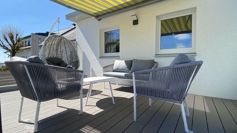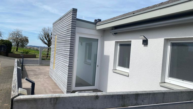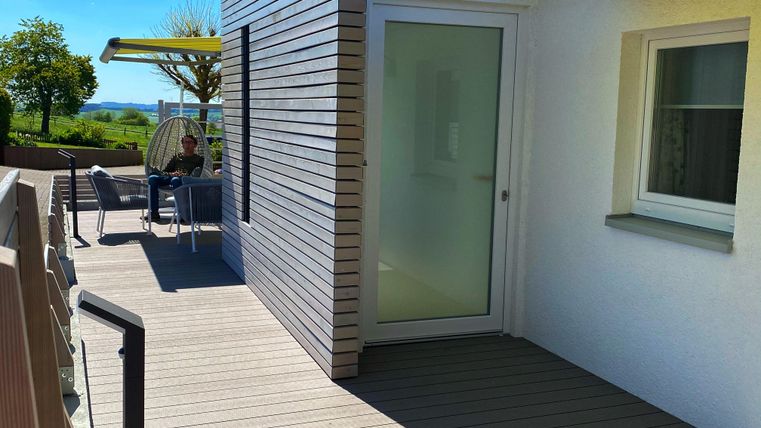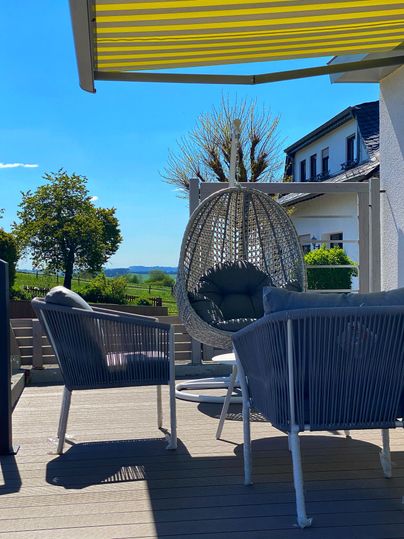 Auf unserer Terrasse finden Sie wunderschöne Lounge-Möbel, die zum Entspannen und Verweilen einladen. Genießen Sie die frische Luft und den herrlichen Ausblick auf die umliegende Natur. Zudem bieten wir Ihnen zwei elektrische Markisen, die Ihnen Schutz vor Sonne bieten.